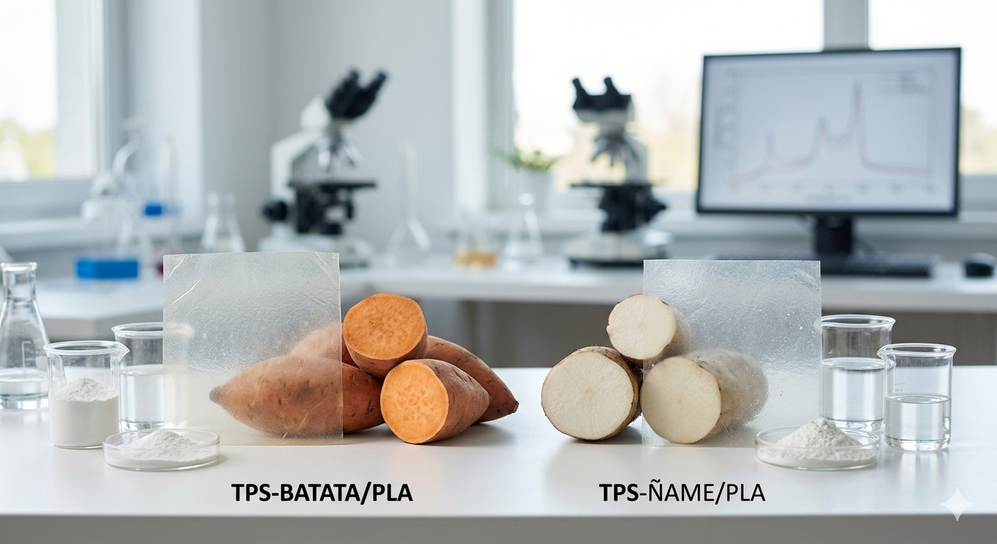 Google Gemini. (2026). Películas de bioplástico translúcidas mostradas junto a tubérculos de batata y ñame enteros y cortados en un entorno de laboratorio [imagen generada por AI].